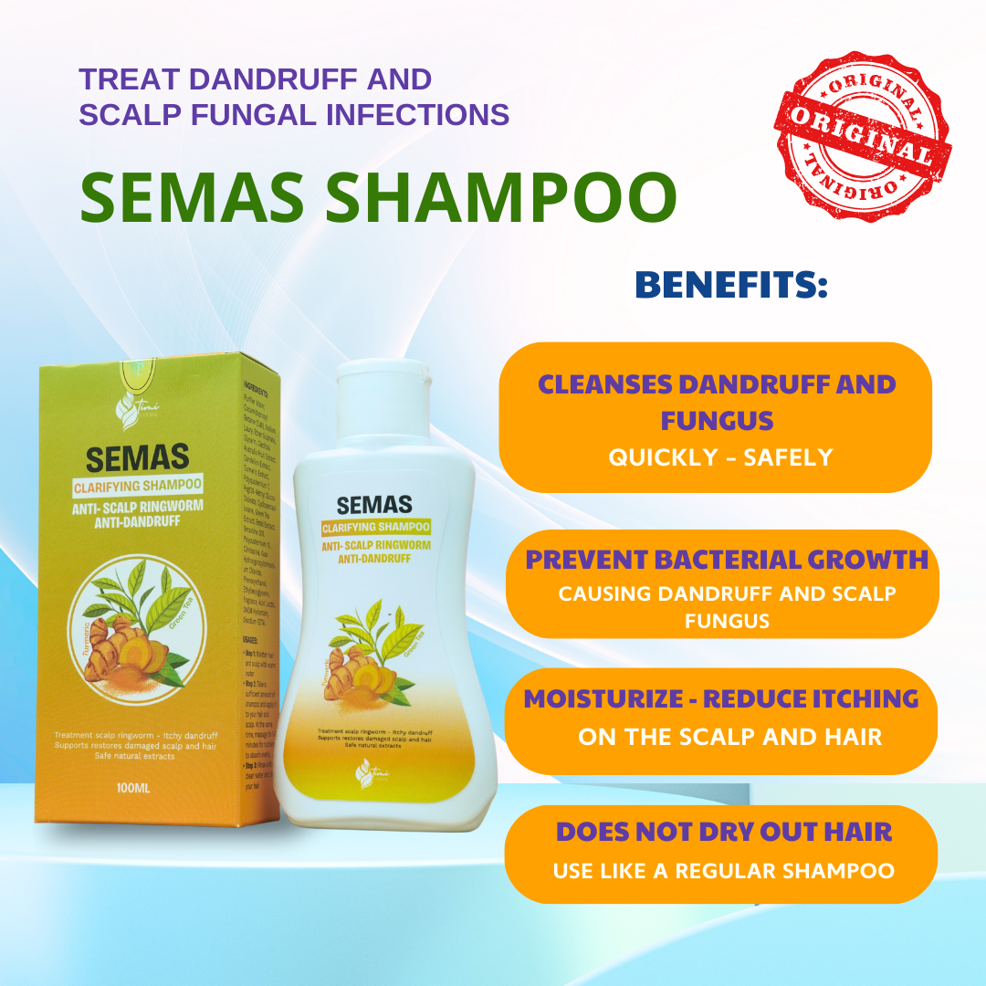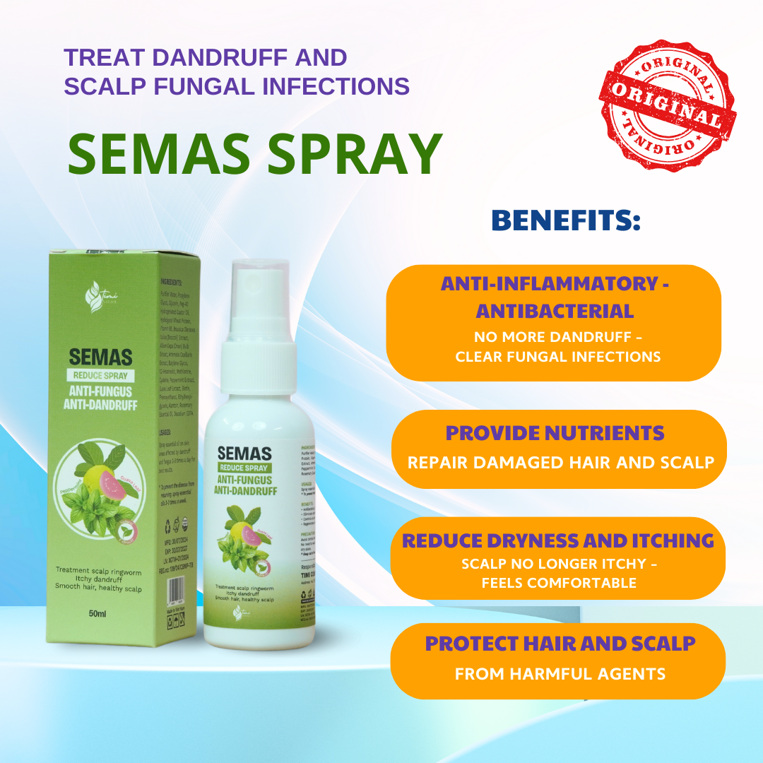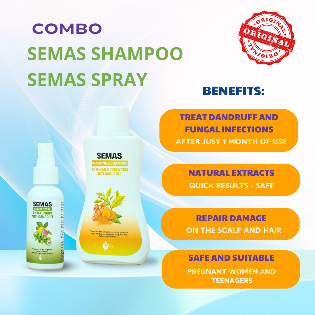 Introducing the SEMAS product line, which includes a shampoo and essence spray specifically designed to prevent and treat dandruff, itching, and scalp fungus. Formulated with natural extracts such as mint, guava leaves, turmeric, green tea, and other beneficial ingredients, this product quickly reduces dandruff, itching, scalp fungus, and seborrheic dermatitis. Additionally, SEMAS helps repair damaged hair and scalp, stimulates hair regrowth, and provides a healthy, clean scalp and vibrant hair. The combo includes: 04 SEMAS shampoos and SEMAS essence.