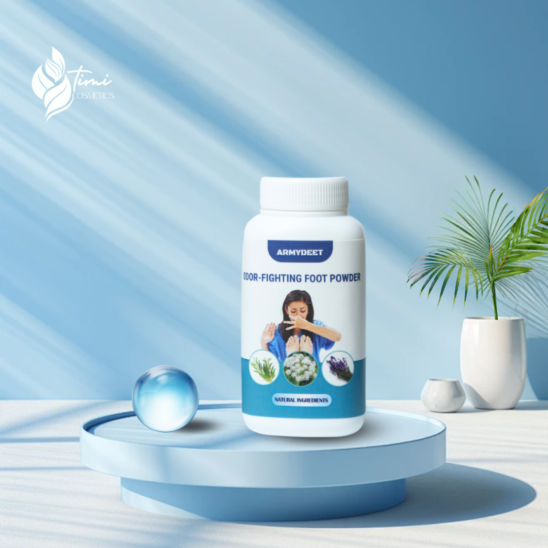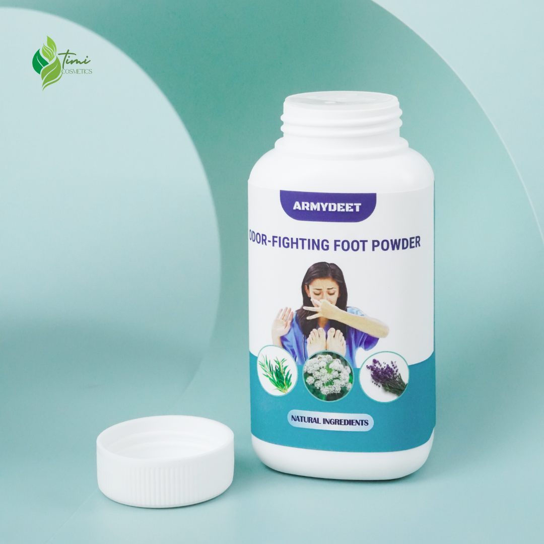 The latest foot deodorant powder from Timi Cosmetics - ARMYDEET features a superior formula that eliminates and prevents odor-causing bacteria, reducing sweat production. With safe and gentle natural extracts from Alum Powder, Cnidium monnieri seeds, Angelicae dahurica, Lavender, Cinnamon, and Tea tree oil... Just use ARMYDEET, and your worries about unpleasant foot odor and embarrassment due to body odor in front of others will disappear. You will have dry, odor-free feet, and feel confident all day long.
