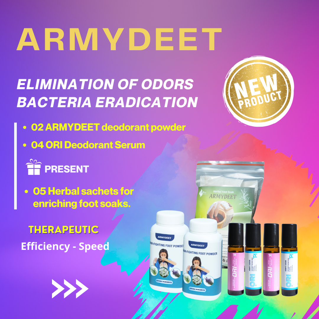 Discover the ARMYDEET Body Odor Control Set, the perfect solution for freshness and confidence all day long. This set includes: 02 bottles of ARMYDEET Foot Deodorant Powder (50g/bottle) and 04 ORI Deodorant Serums (10ml/bottle). Plus, with your first purchase, you'll receive 05 packs of relaxing herbal foot soak – to relieve aches and stress while enhancing overall health. All products are made from natural ingredients, ensuring safety and effectiveness. They eliminate odor-causing bacteria, reduce sweat, and keep your underarms and feet dry and fresh. Experience the difference and boost your confidence with ARMYDEET!