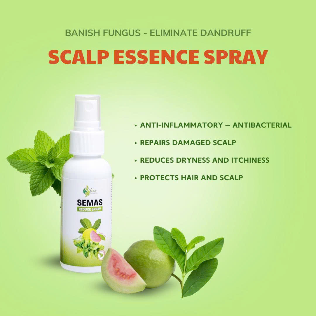 SEMAS Essence Spray, with a 50ml volume, features extracts of mint and guava leaves, providing an effective solution for scalp care. This product soothes the scalp, reduces itching and irritation, and supports the treatment of dandruff and scalp fungus. Mint extract cools and refreshes, while guava leaves deliver essential nutrients to repair and protect the scalp. SEMAS Essence Spray is easy to use and offers a comfortable feeling, helping keep the scalp clean and healthy every day.